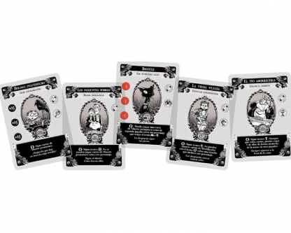 La desgracia sigue sus pasos. Huéspedes horribles Invitados inoportunos toma su nombre de esos indeseables personajes que van de familia en familia durante la partida con fastidiosos resultados. Y también añade una horrible hueste de nuevas cartas de Modificador, de Evento y de Muerte prematura.