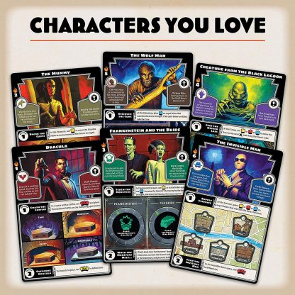 Horrified es un juego cooperativo en el que tú y tu grupo se enfrentarán a los monstruos clásicos del mundo cinematográfico de Universal a través de un escenario que recuerda los nostálgicos años 50. Luchen contra Drácula, el Hombre lobo, Frankenstein, el Hombre invisible, el Monstruo del pantano, la Momia y la Esposa de Frankenstein, y juntos creen la mejor estrategia para derrotarlos. Cada monstruo tiene sus propias habilidades y su propia manera de ser derrotado, por lo que el juego ofrece muchísimas horas de terror y entretenimiento.