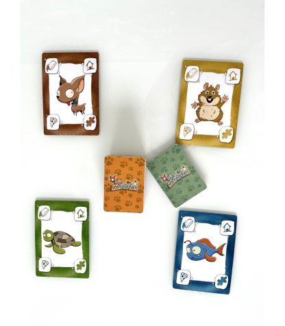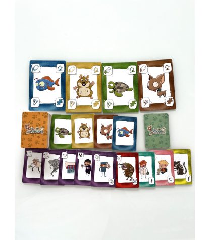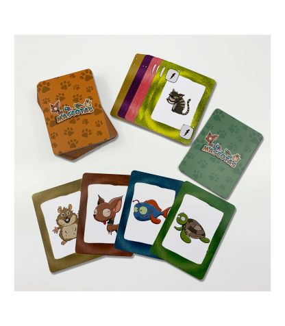 MASCOTAS es un divertidísimo juego para todas las edades que contiene 82 cartas tamaño poker que incluyen 8 mascotas objetivo, las cartas de cuidados de mascota (casitas, juegos, comida y aseo), cartas de estado (enfadadas, enfermas, sanas y mimitos), y las cartas de acción como el niño travieso, la tienda de mascotas, o el temible científico loco.