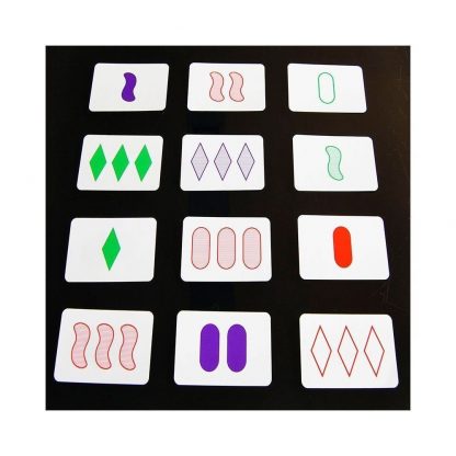 Para obtener un SET un jugador debe encontrar 3 cartas en las que cada una de las 4 características sea igual o diferente en todas ellas. Las características son: símbolo (óvalos, ondas o rombos), color (rojo, verde o lila), número de símbolos (uno, dos o tres) y fondo (sólido, rallado o sin fondo).