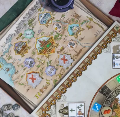 Contractors incluye un nuevo tablero personal para cada jugador que se anexa al taller base (de manera muy satisfactoria) donde ubicaremos a nuestros contratistas. Se trata de unos meeples de diseño único que incorporan otra nueva mecánica de juego, favorita de muchos: el posicionamiento de trabajadores. En nuestro turno podremos elegir enviar contratistas a una de las ciudades del ducado de Moscú gastando permisos, un nuevo recurso que también incorpora la expansión. Cuantos más contratistas haya en una ciudad, más permisos necesitarás para enviar un cosaco allí. Esto te permitirá tomar una loseta de especialista y colocarla en tu taller, si puedes pagar por ella, en la sección del dado negro.